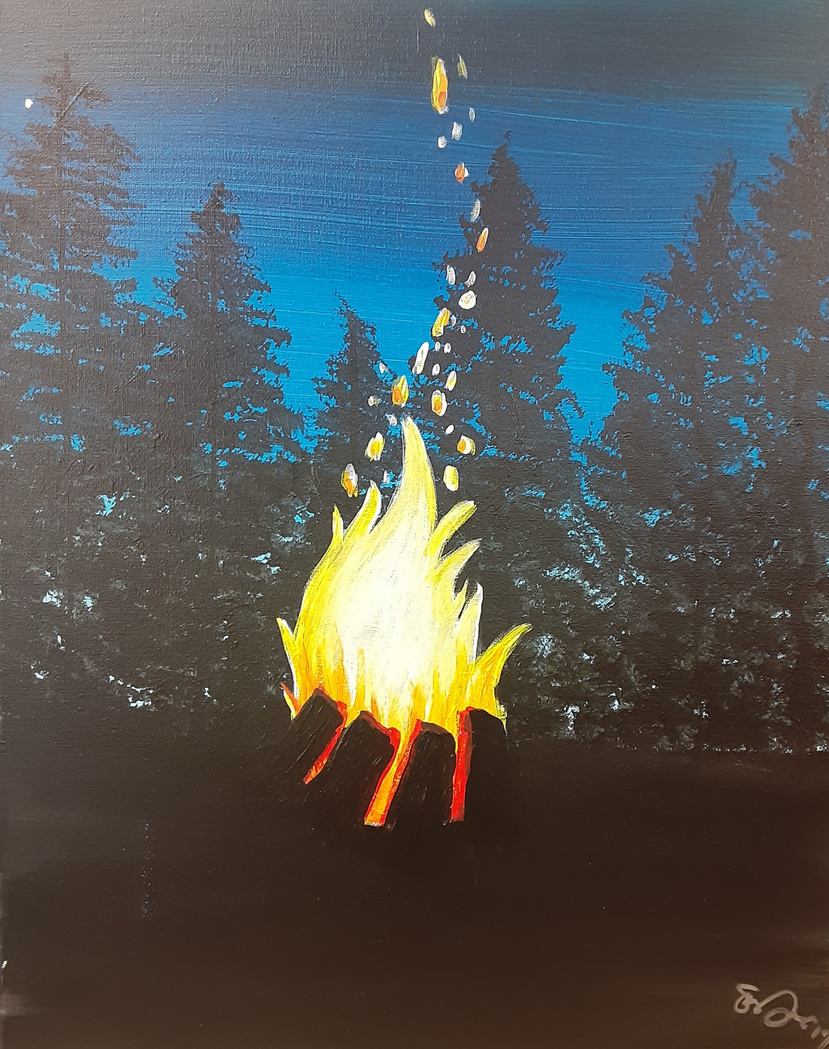 Come learn to paint this nighttime camping scene in acrylic. Can add glow in the dark paint to make your fire come alive. All supplies included 16×20 canvas