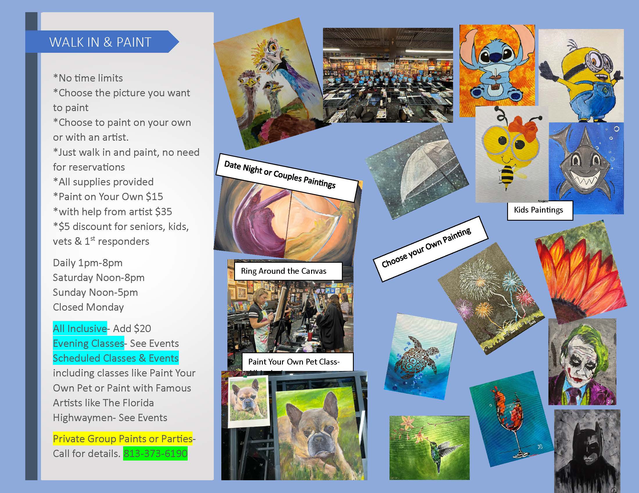 Daily from 1pm -8pm, Saturday Noon to 8pm if no events, and Sunday until 5 we have walk in painting, you can just show up and pick out whatever you want to paint, no time limits and no experience necessary. Closed Mondays. You can paint on your own for just $15 or you can paint with the help of an artist for $35 or $30 if you are over 55, under 18, a vet or a first responder. No need to buy tickets ahead of time but you can if you like.