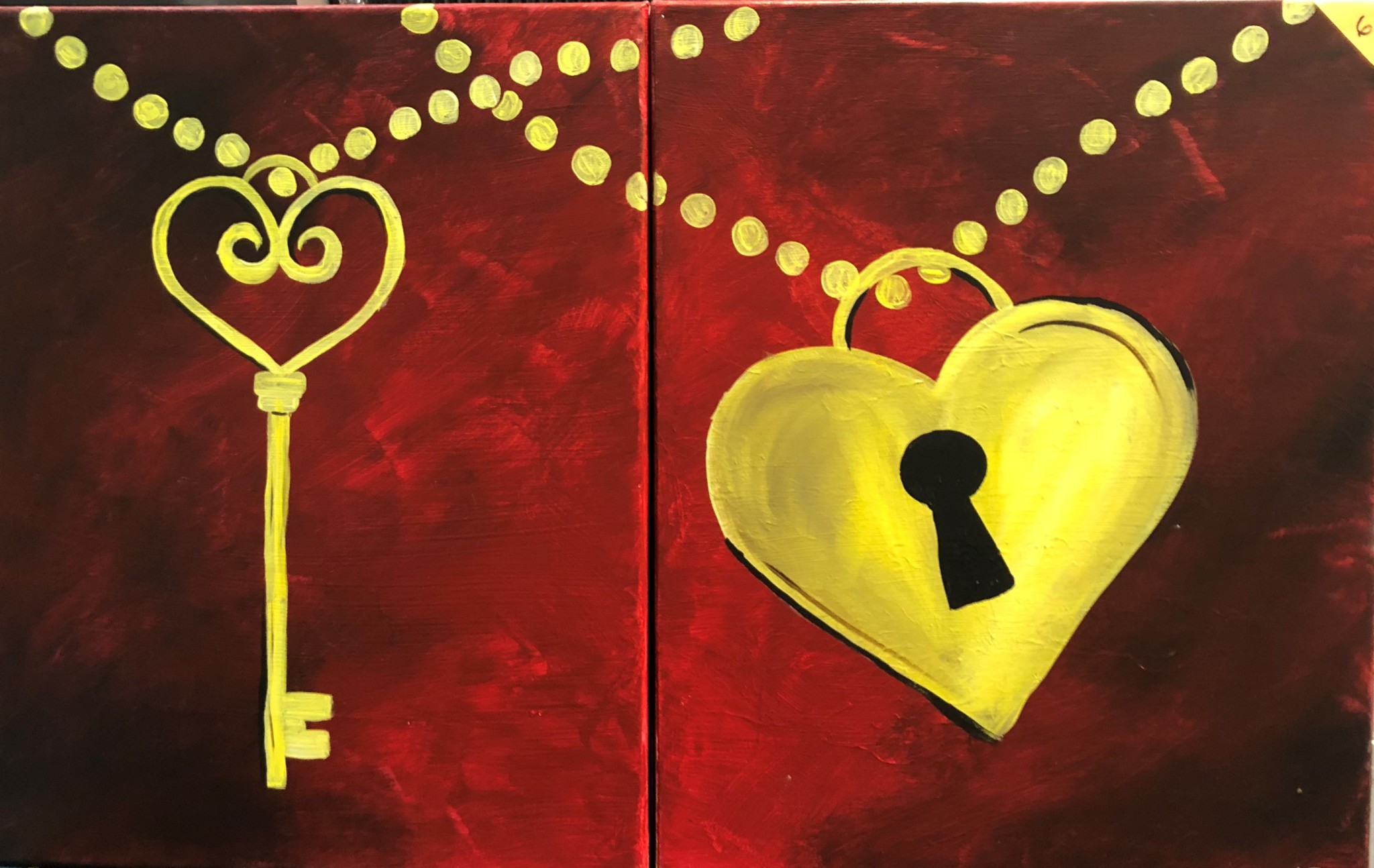 The price per couple for everything is $70, there is always a discount of $5 off for per senior or veteran. Unlike many other paint and wine hosts, we let you take as long as you need to finish your masterpiece. If you do not finish you can always return at any time to complete your piece at no additional charge. You can choose from a selection of many of our two piece paintings.