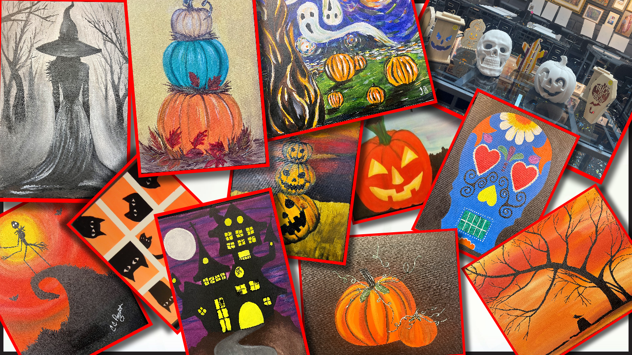 Daily from 1pm -8pm, Sunday until 5 we have walk in painting, you can just show up and pick out whatever you want to paint or you can buy a ticket in advance. Closed Mondays.  You can paint on your own for just $15 or you can paint with the help of an artist for $35 or $30 if you are over 55, under 18, a vet or a first responder.  We will be closing today at 5 for trick or treating, Have fun and we will leave some candy out front in case in little ghosts or goblins come by. You will be given a 16 x 20 canvas, paints, brushes and a clean smock to keep the paint off your clothes. Everyone has their own desk and there is no rush as we have no time limits on your painting adventure. If you can not complete your piece in one sitting you can always come back and finish it another day, no extra charge.  We have beverages and snacks for a small charge. No experience is necessary. You will leave with a completed painting. All ages are welcome. You can choose what ever picture you want to paint, the picture in the post are just suggestions.